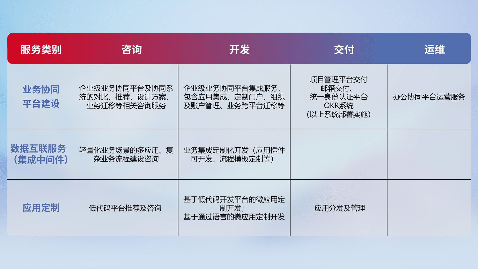 针对钉钉、、、企微、、IDaas等平台级产品提供产品的规划、、、方案、、、交付、、定制化开发等服务,,,实现如统一协同办公、、、智能客户服务、、、混合会议管理、、、、智能数据查询、、等业务场景,,,,实现数字化转型。。。。